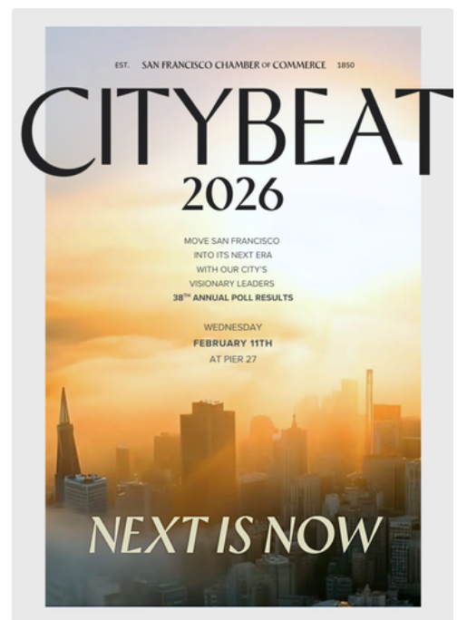 The Chamber of Commerce’s Annual City Beat Breakfast takes place next Wednesday, February 11. This signature event features remarks from Mayor Lurie and a leading economist, along with the release of the Chamber’s annual survey of San Francisco residents, offering insights of how San Franciscans feel about the city’s direction. The event is sold out, with nearly 600 attendees, and the first 90 minutes are dedicated to networking.